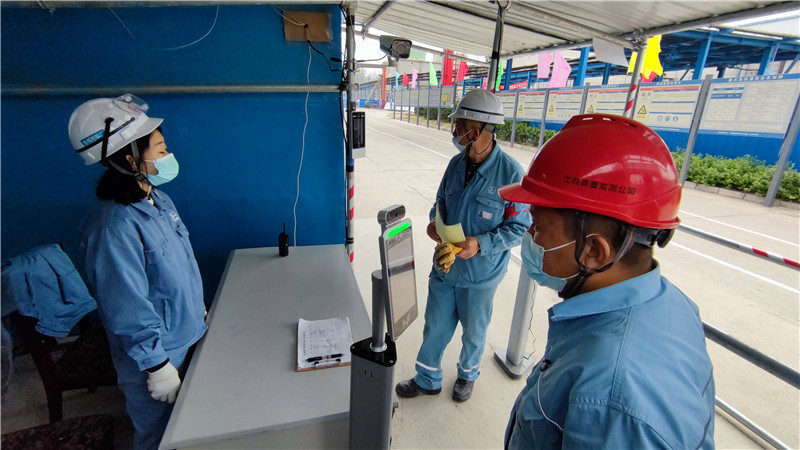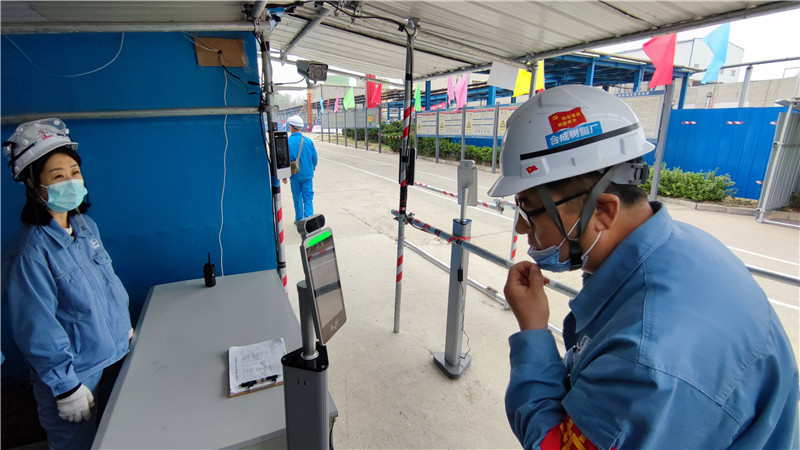 清晨,三聚裝置檢修現(xiàn)場的入口,施工人員們正排著隊對著考勤一體機刷臉,機器顯示通過后,方可進入施工場地。
