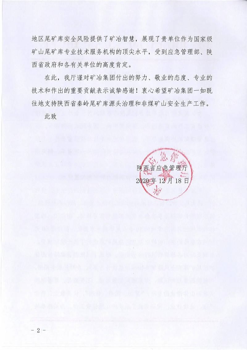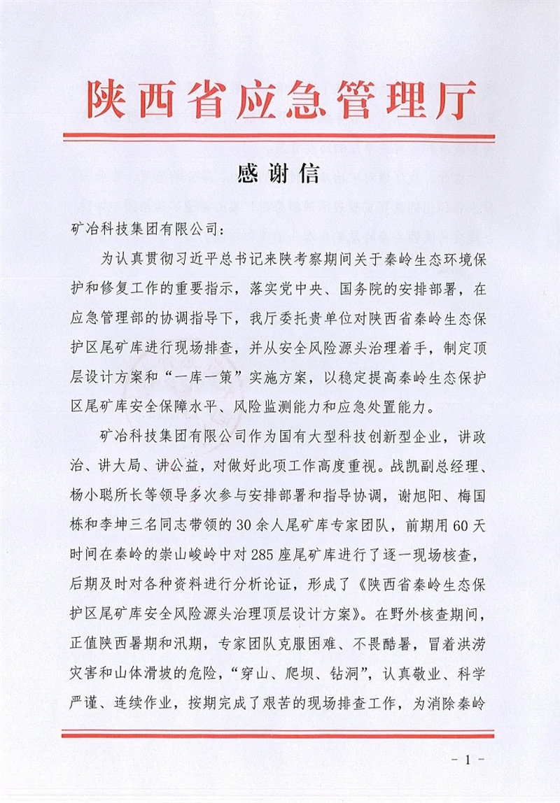 為認真貫徹習(xí)近平總書記在陜西考察期間關(guān)于秦嶺生態(tài)環(huán)境保護和修復(fù)工作的重要指示,礦冶集團受陜西省應(yīng)急管理廳的委托對秦嶺地區(qū)的285座尾礦庫逐一進行了檢查,公司作為重要參與力量,先后派出多位同志參與現(xiàn)場檢查,檢查期間克服困難,不畏酷暑,“穿山、爬壩、鉆洞”,完成現(xiàn)場檢查工作后又認真編寫了“一庫一策”報告,為集團制定陜西省秦嶺生態(tài)保護區(qū)尾礦庫安全風(fēng)險源頭治理頂層設(shè)計方案貢獻了公司力量。該項工作最終獲得應(yīng)急管理部、陜西省各級應(yīng)急管理部門和企業(yè)的認可與好評,陜西省應(yīng)急管理廳為此特向礦冶集團發(fā)來感謝信,我公司將再接再厲為應(yīng)急管理部門做好安全風(fēng)險源頭治理工作提供有力技術(shù)支撐。